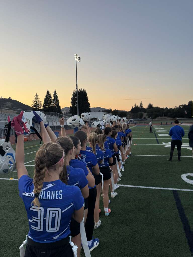Led by 1st team all league defender Avery DeMent’s 10 tackles, the defense was stifling. DeMent’s carefully calculated angles and quick hands shut down the center of the field for Pittsburg’s offense. Senior Julia Munter spent the majority of her evening in the Pittsburg backfield disrupting play after play. Munter finished the game with 5 tackles and countless quarterback pressures. The Acalanes secondary smothered Pittsburg’s speedy receivers all night. Defensive backs Maya Shoenhair and June Natal both had drive-killing interceptions with impressive returns and rusher Mallory DeCredico iced the win with a sack of the Pittsburg quarterback in the endzone for a safety late in the 4th quarter. DeCredico’s safety was the first in the 3 year history of the program.