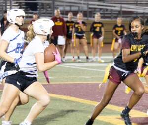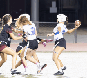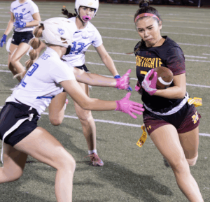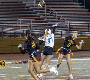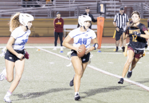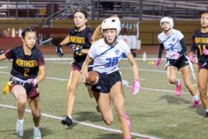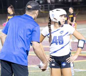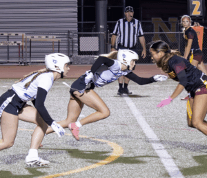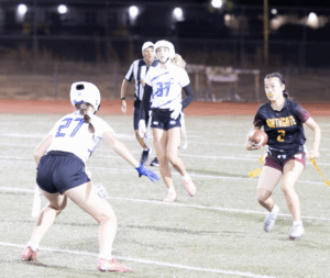 The Dons started on offense and what a start it was. Junior all-everything quarterback Ines Coyne’s first pass of the night was a dart to 1st team all league receiver Maya Shoenhair for 10. Coyne then pitched to sophomore standout Isabelle Agnost who quickly gained 15 more. Another run from Agnost got the ball to the Broncos 12 yard line. On 3rd and goal from the 12, Agnost kicked with her spurs and left Bronco defenders in the dust, racing into the endzone for the touchdown. The point after was no good and the Dons were out to a quick 6-0 lead. On Northgate’s first possession the Dons’ dominant defense immediately asserted itself. On first down, pash-rusher extraordinaire Julia Munter stopped the Broncos for no gain. On second down, linebacker Santana Tamayo, stopped the Broncos after a 1 yard gain and on 3rd down, linebacker Stella Beuchotte stopped the play for no gain to force a quick 3 and out. On the ensuing drive, the Dons offense would march down the field taking up the remainder of the first quarter and continuing into the second. Coyne continued her hot start, firing a laser to receiver Mira Clark. A Bronco defender got there too early and was flagged for the pass interference giving the Dons 10 free yards and another first down. On the next play it was Coyne to Clark again, this time for 8. The Broncos defense stood strong for the next several plays but on 4th and 5, Coyne pitched to Agnost who galloped for 9 and a first down. The Dons two-stepped their way down to the 16 yard line. The Northgate defense had figured out by this point that this Agnost kid could run. Well she can throw too. On 3rd and goal, with the entire Northgate defense crashing down on her like a Texas tornado, Agnost launched a 20 yard pass into the endzone to wide open Tamayo for the touchdown, a great call by Sheriff Mike Ivankovich and Deputy Joe Escobar. The point after was no good and the lead stood at 12-0.
