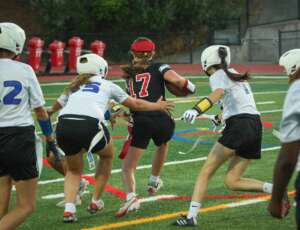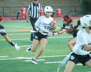 But the Dons didn’t flinch. Titus and Raher strung together consecutive first downs before Titus found the end zone to trim the deficit to 7–6. Monte Vista took over and drove down the field and despite a key tackle by freshman Emilia Deutsch Stella which put the Mustangs on their heels, they were eventually able to strike back with a 29-yard touchdown run, extending the lead to 13–6, but undeterred, Acalanes answered right back on a Titus 21 yard run to the red zone and a Raher strike to Gallagher for the go-ahead score. Suddenly, the Dons were on top 14–13.