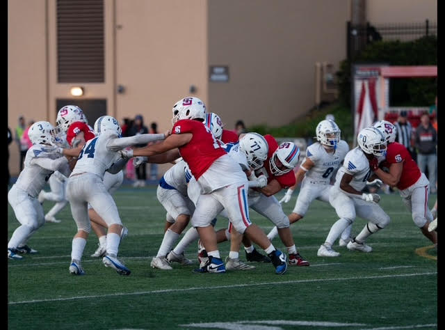The night’s most dramatic sequences  was all in the second half Driving to take the lead, the Dons called a shovel pass to sophomore Sean Tandler, a play that had worked earlier. Tandler broke through the line but was met with a big hit at the SI 15-yard line, coughing up the ball.