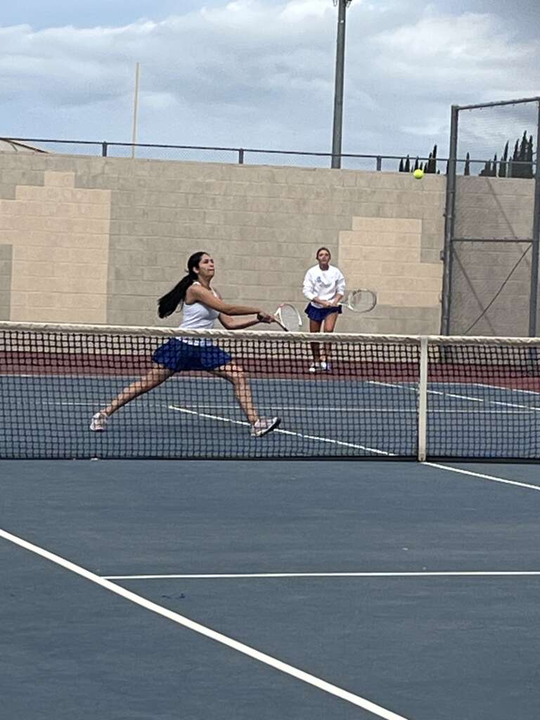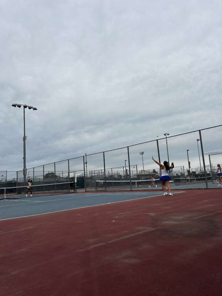 Just as matches were set to begin at 9 a.m., drizzle turned into a brief but heavy downpour, creating puddles on the courts. Shout out to Mr. Satterfield and Mr. Griemens for helping dry off the courts—thanks, Dads! After a three-hour delay, play finally began just before noon.