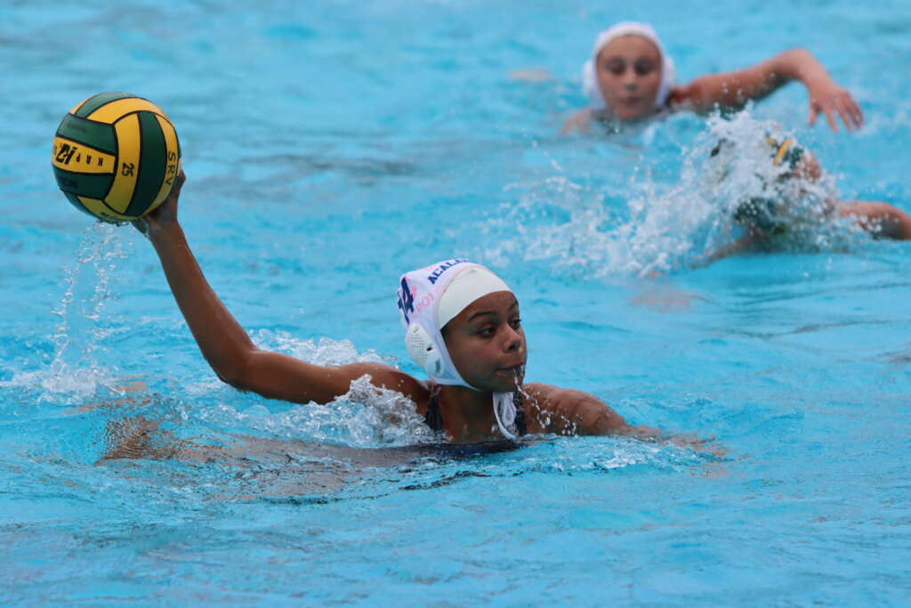 Quarter three was a quick one. SRV won the sprint, but the game turned into a swim meet again with steals by Sara Williams and Malin Stone. Acalanes did get the ball into set and Finley Graff shot a great backhand to earn her hat trick. The Wolves gained some momentum and scored the next three goals to lessen the lead and end the quarter 8-7.