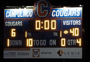 The glitz and glamour of Monday Night Football traveled to Moraga CA this week as the visiting Acalanes Dons took on their cross town rivals, the Campolindo Cougars, for middle school bragging rights in the final game of the regular season. It was senior night for Campolindo. The Cougars rolled out a giant, light up “C” and had their cheerleading squad out in force to show their seniors off in style. In a classy move, the Cougars acknowledged the six seniors on the visiting Dons. Once the celebration and photos were concluded, it was time for some football.