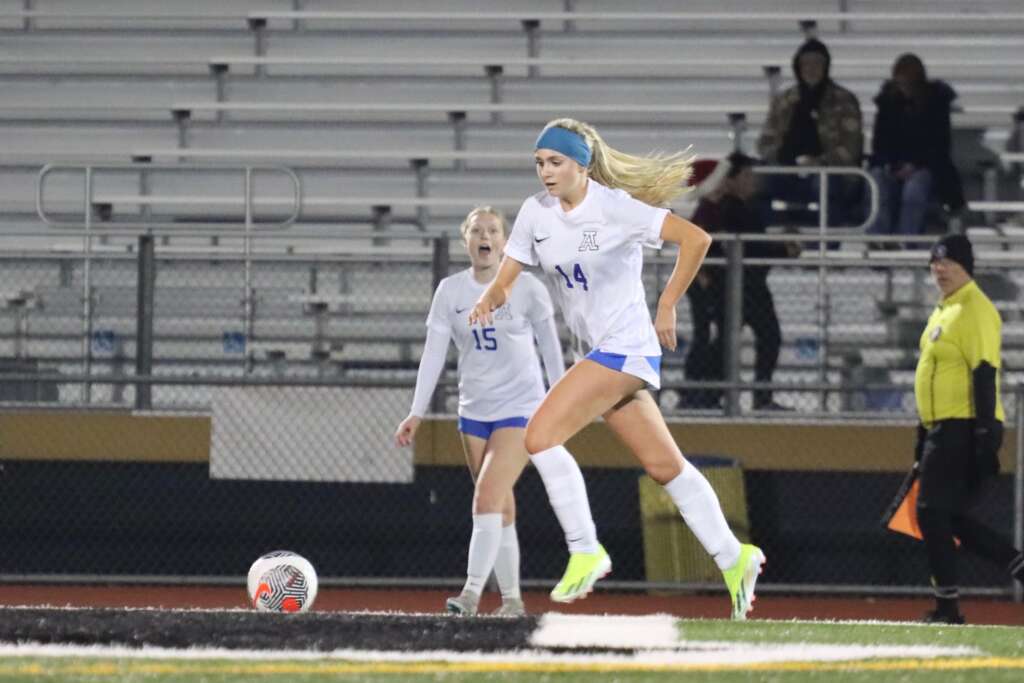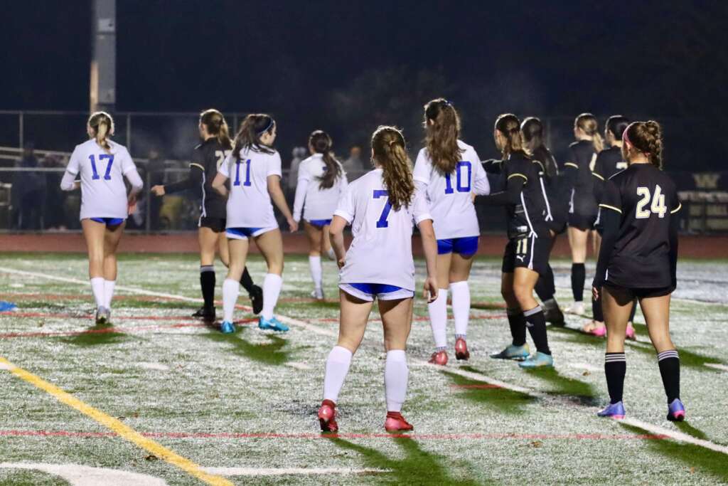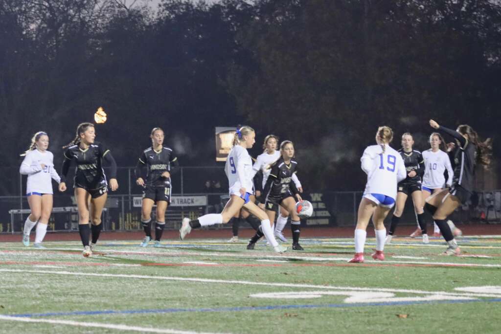 Windsor played the second half just like the first – aggressive and fast. The defensive line of Sierra Goyert, Culbertson, DeMent, and Keely were tested early when a Windsor player made a long pass up for their winger who one touched a shot past Lewis who was wisely coming out to cut off the ball. But, Keely streaked in and cleared the ball away from an open goal – a heroic save!