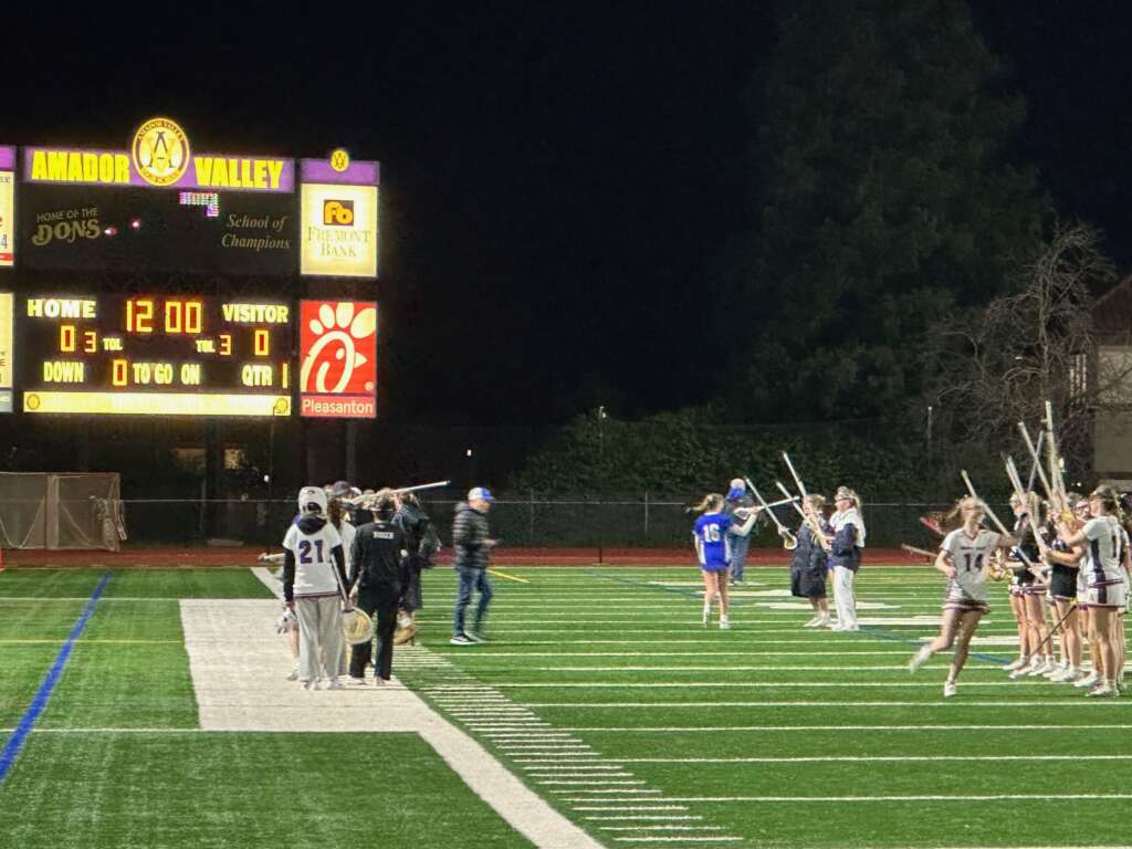 The team kicked off their season on Friday on the road against the Amador Valley Dons, a team ranked #21 in California that came to Lafayette for opening day last year and left with a 22-5 victory, in a game that should have had an asterix assigned to it as Acalanes was missing a number of girls who were wrapping up the soccer season.  This year, with the team at full strength, the Dons battled from the opening draw but ultimately came up a bit short 13-12 in a game that featured a number of lead changes, physical play, announcers who altered last name pronunciations but rocked the tunes, and actual and figurative fireworks including a coach “asked” to leave the sideline for the first time in his 10 year career.