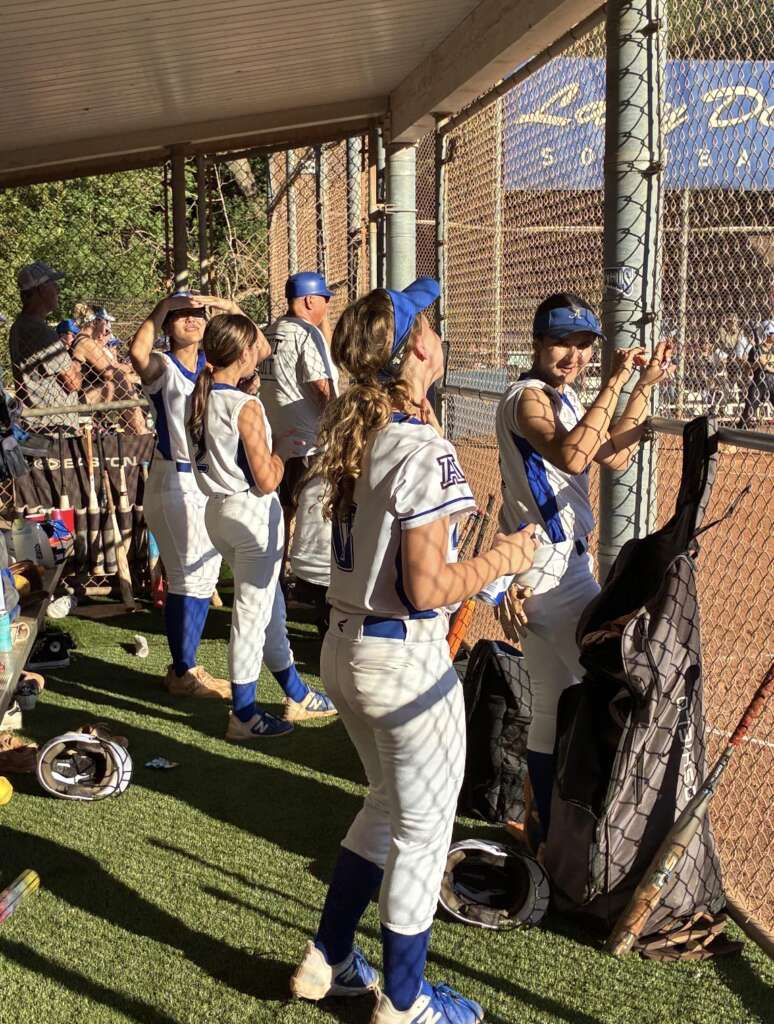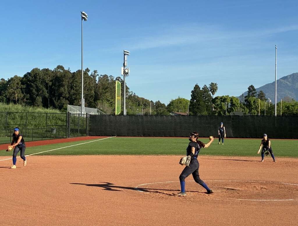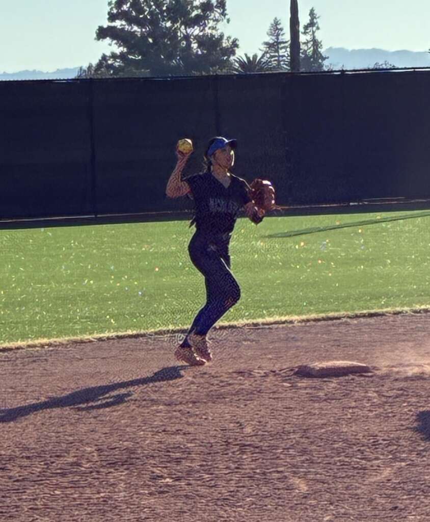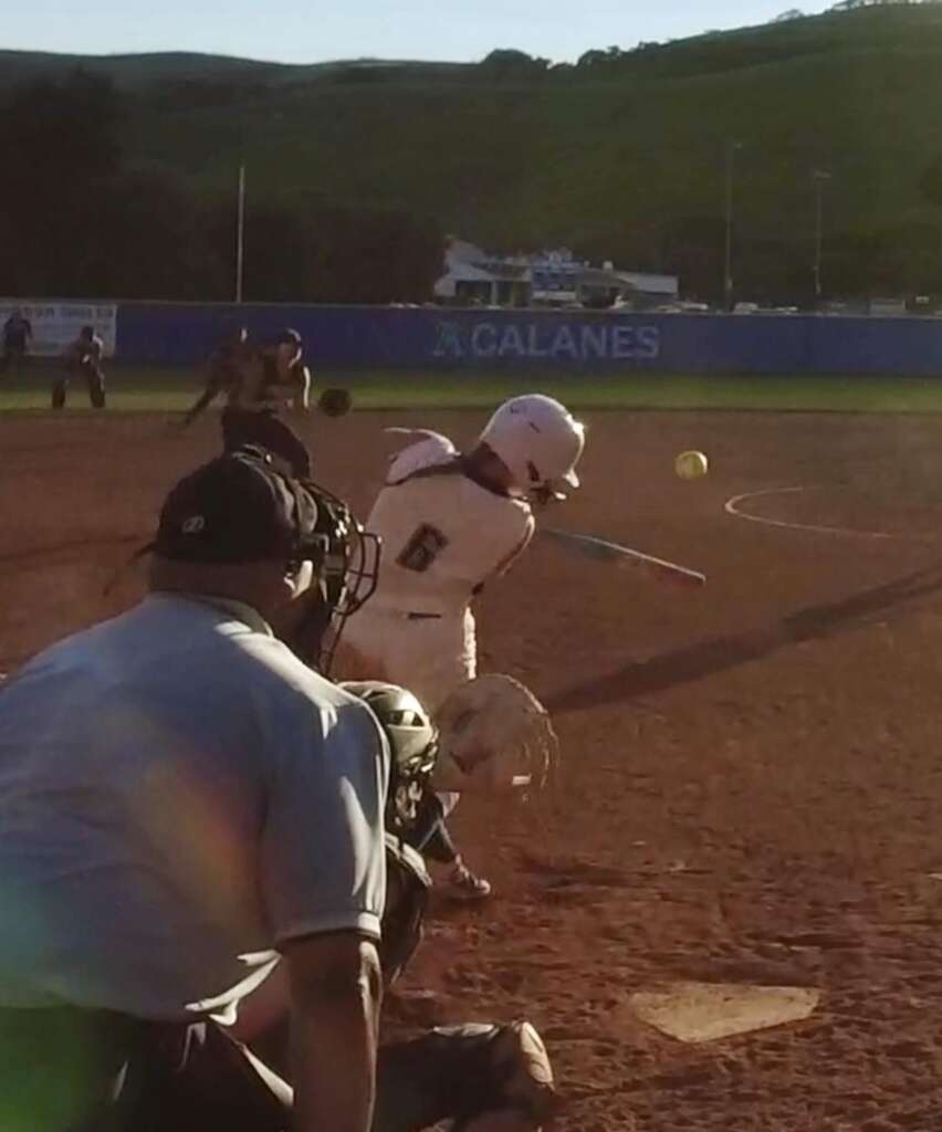 Acalanes Varsity Dons got on the board in the top of the first inning after Sophomore Sensation Prime Time June Natal (carrying on her nickname from her fall Varsity Flag Football season) singled, scoring one run. Junior “Lucky 7” Vanessa Choi was a threat in the batters box when she tripled, scoring two runs. Junior “Nothing Gets By Her Catcher” fired up her bat as well Gabby Huerta singled, scoring one run. Sophomore first baseman Nella Rawski, added to base runners when she got hit by a pitch. And both new-to-softball-but-you-wouldn’t-know-it Junior Avery DeMent and Freshman Addison Horwath got on base with Dement a walk and Horwath singling, scoring one run.