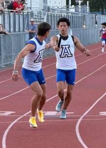 The Acalanes boys 4×400 A-Team Julian Hood, Matthew Schwarz, Benjamin Mickelson, and River Lockwood relay took first place with 3:29.65.