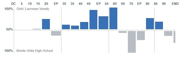 Midfielders Grace and Kelly dominated the draw, collecting a total of 17 between them, which was 5 more than the entire Monte Vista team. Kelly had a couple notable plays, including one where Grace swatted the draw to her as she was standing a couple feet away and still managed to control the ball, and another where it looked like she was playing hacky sack with the ball on her stick. Charlotte Gellman led the team with two assists, while Grace and Emily each had one. Grace and Emily led the team with 3 loose balls controlled each, Kelly and Reese Tierney had two each, and Kate Uffelman, Charlotte, Reese Imrie and Kate Beaver each had one. Kate Beaver also had a nice steal from the Mustang goalie.