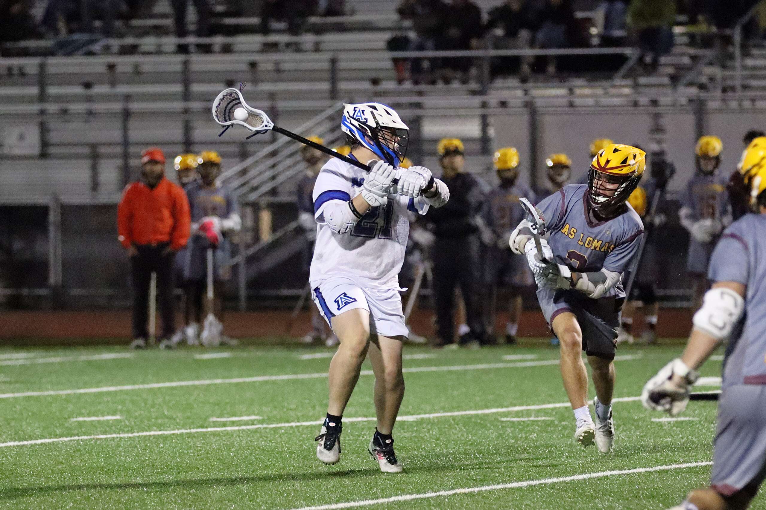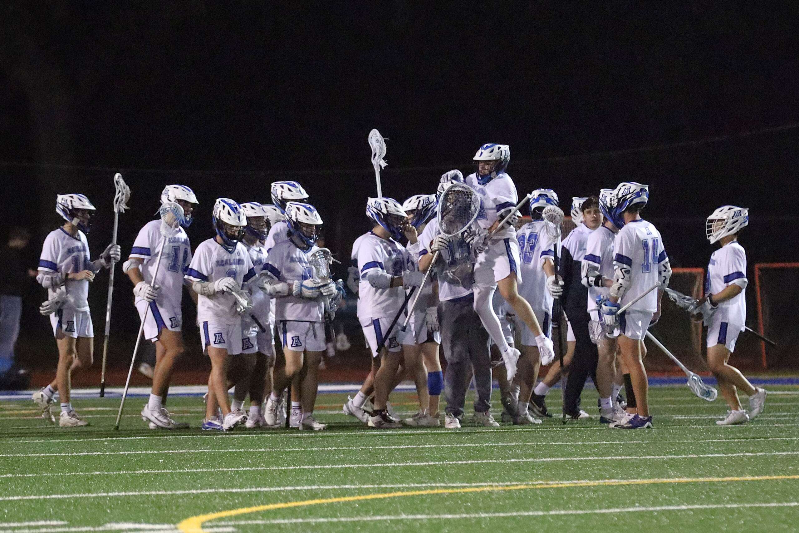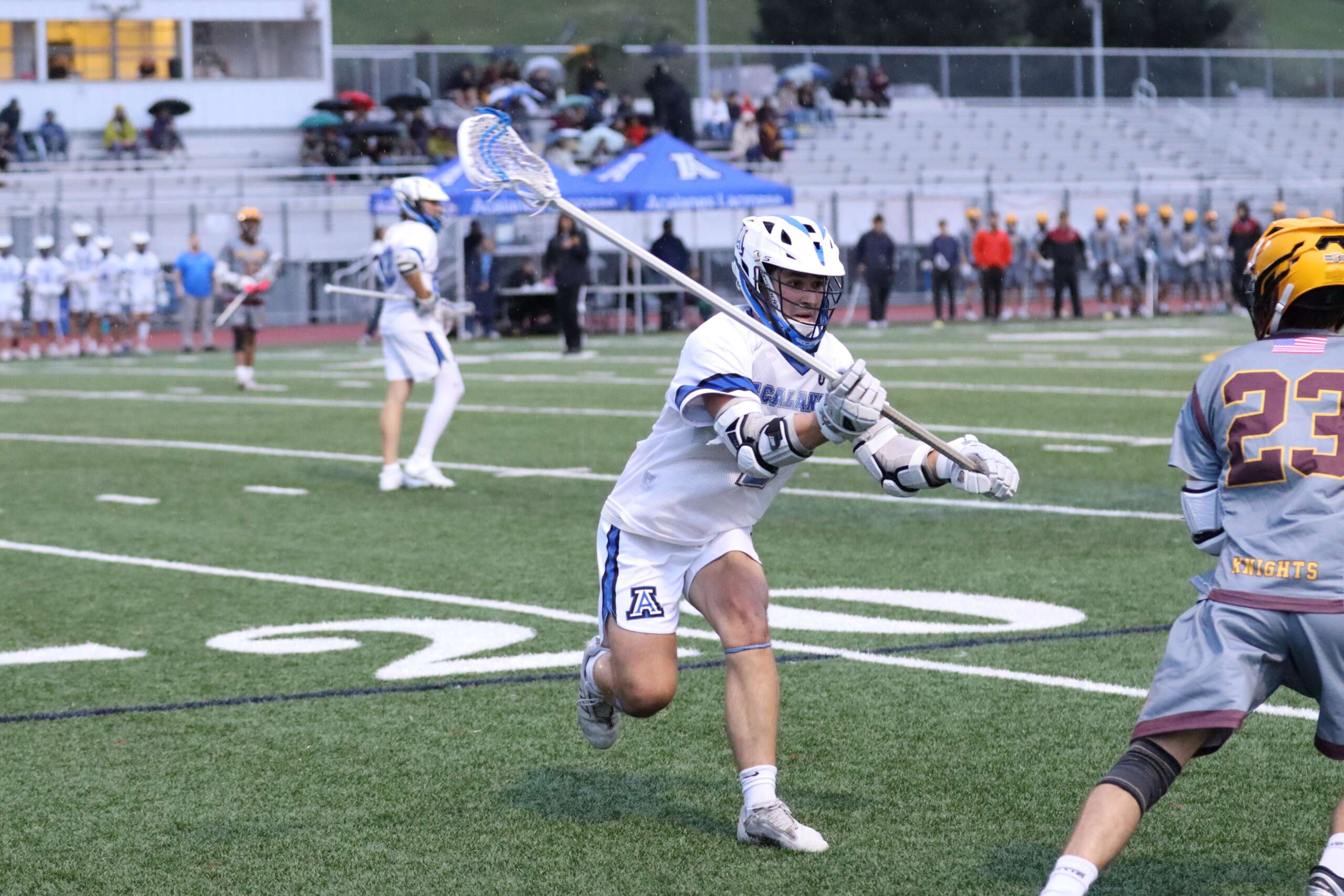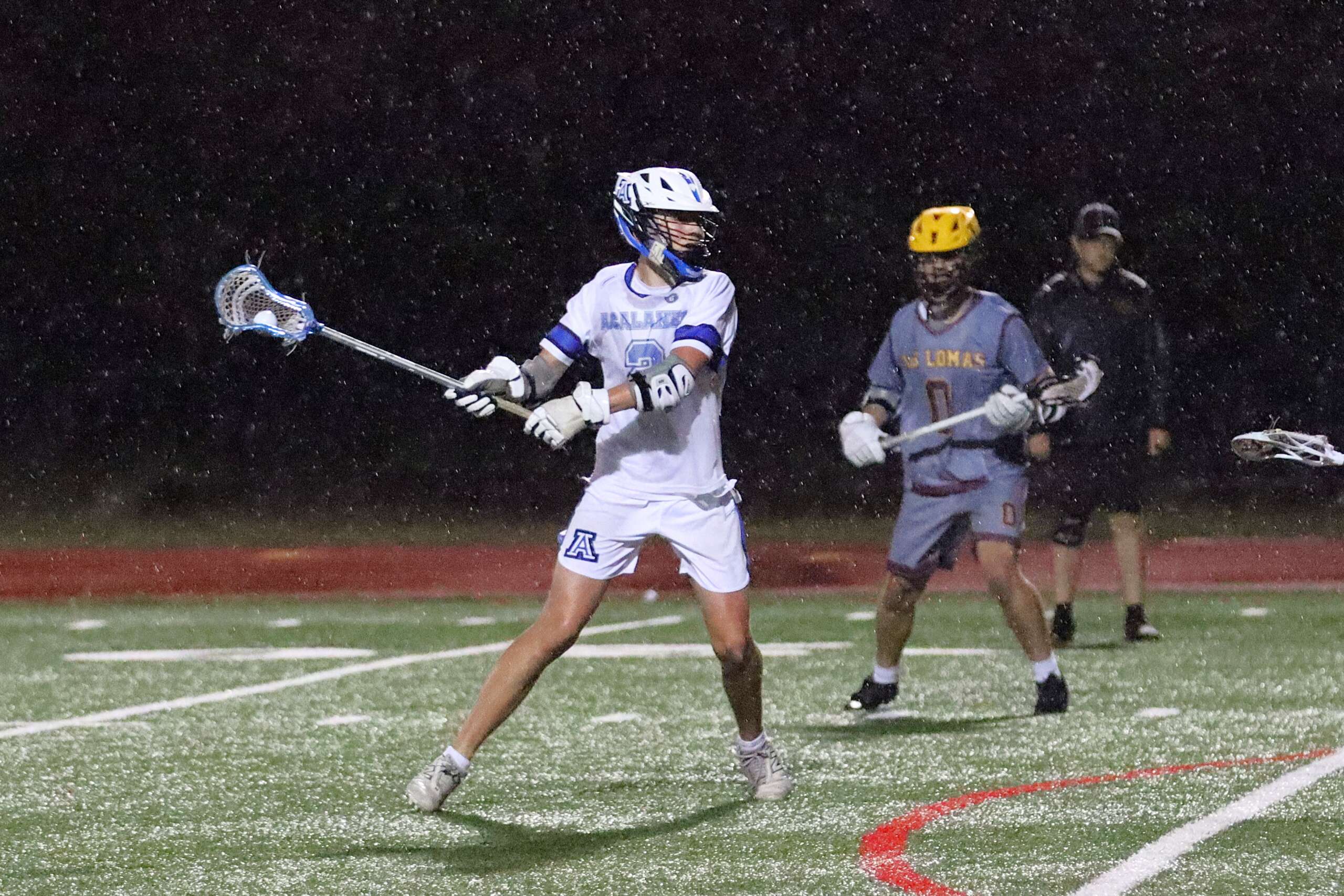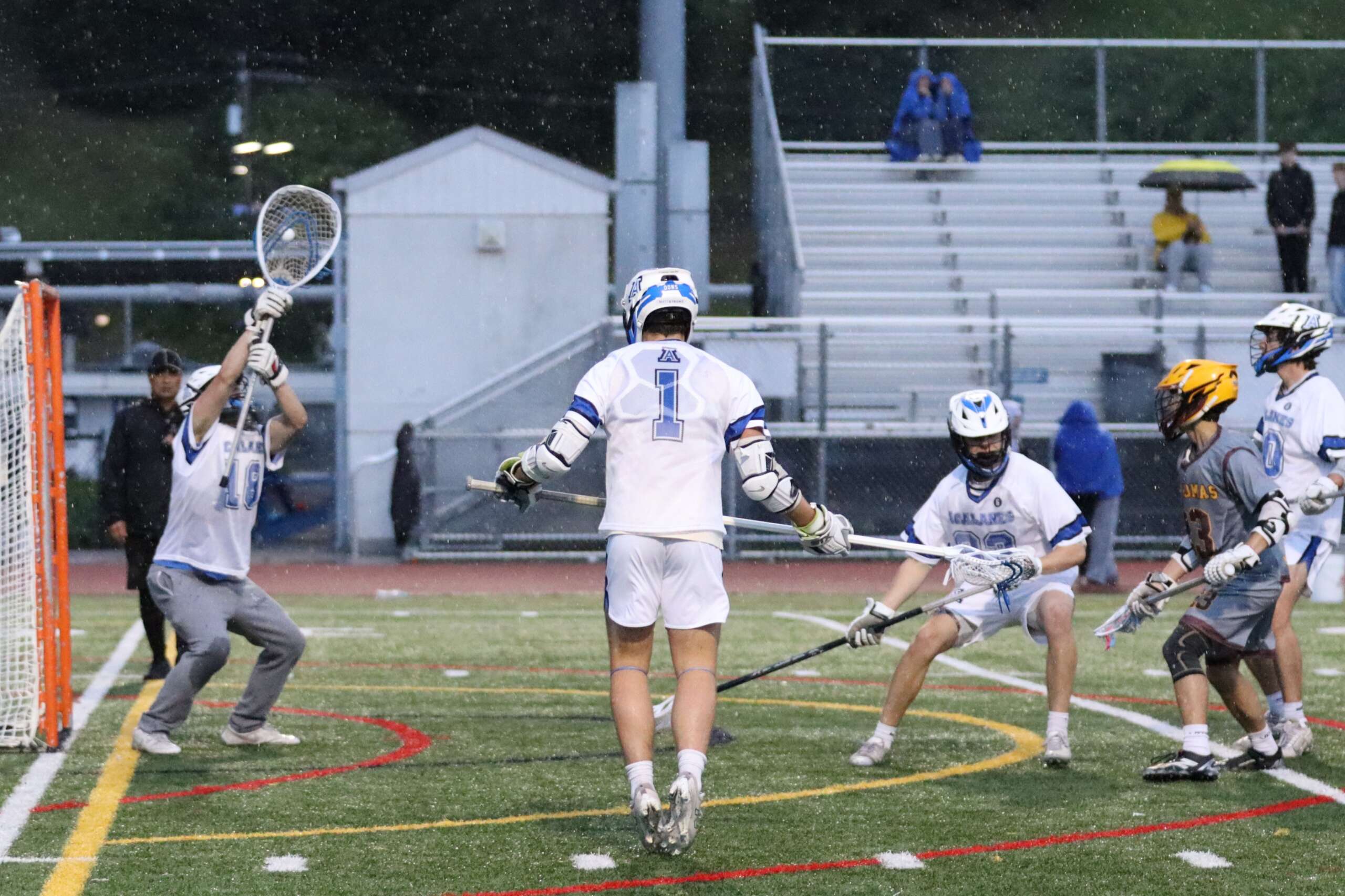As the second quarter began, the skies opened up—but the heavy rain proved to be nothing compared to the heavy reign of the Acalanes offense. Dafferner struck again with a gritty unassisted goal, followed shortly by a Condy-to-Caleb Mason connection. The highlight of the half came just before the whistle: Grant Condy worked his way around the crease and went airborne, firing a spectacular diving shot past the keeper to send the Dons into the locker room up 5-1.